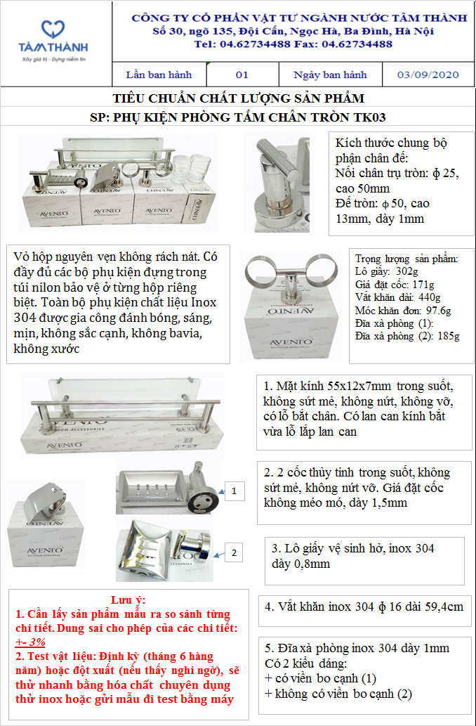 Bộ phụ kiện phòng tắm cao cấp Sus 304 Avento chân tròn TK03 gồm: