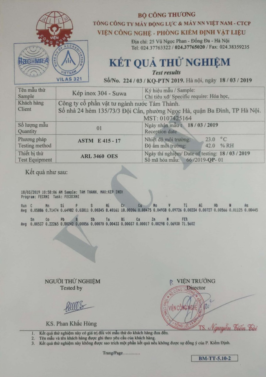 Kết quả test thành phần vật liệu kép inox Suwa chuẩn 304