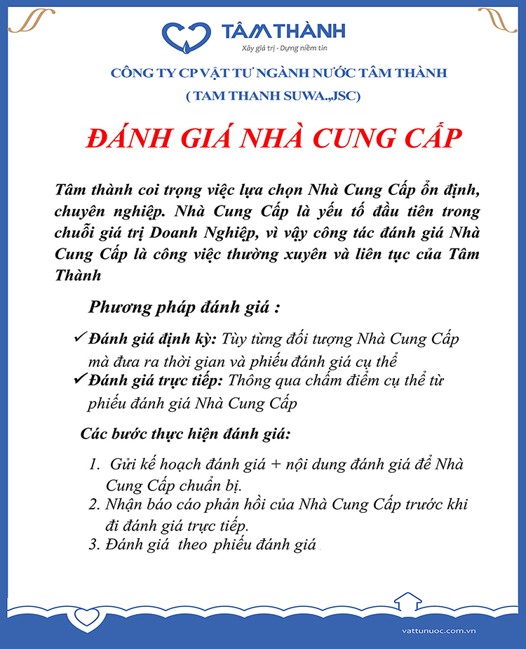 Với phương châm kinh doanh “Xây giá trị, dựng niềm tin” Tâm Thành cam kết cung cấp những sản phẩm chất lượng tốt nhất tới khách hàng. Các sản phẩm của Tâm Thành phân phối đều được công ty kiểm soát theo theo một quy trình chặt chẽ từ khâu sản xuất đến khâu xuất bán hàng. Chính vì thế việc đánh giá nhà cung cấp đối với chúng tôi là rất quan trọng vì chúng tôi hiểu rằng muốn có sản phẩm tốt phải có nguyên vật liệu tốt, quy trình sản xuất chuẩn và kỹ năng làm việc chuyên nghiệp.