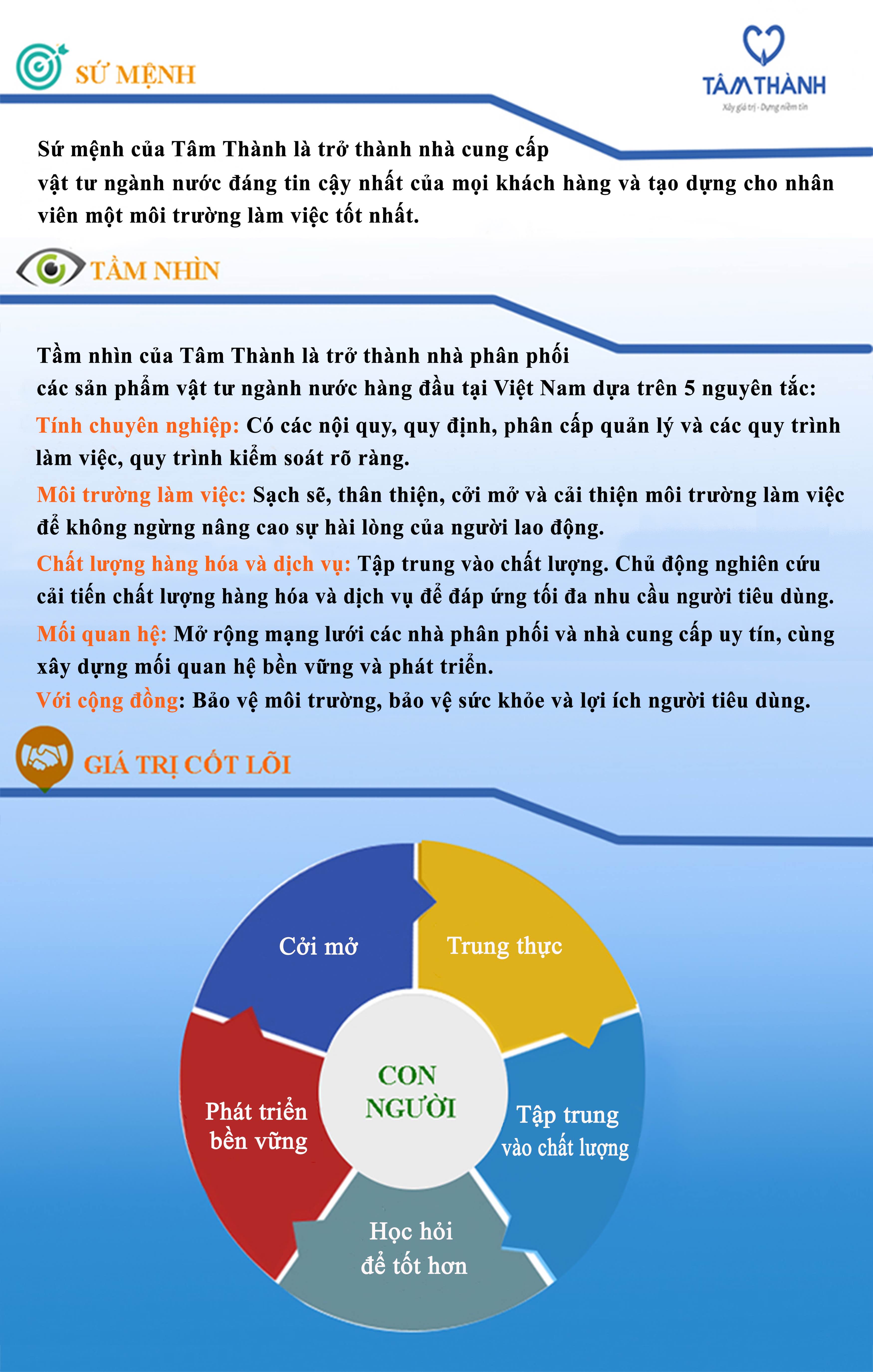 Sứ mệnh của Tâm Thành là trở thành nhà cung cấp vật tư ngành nước đáng tin cậy nhất của mọi khách hàng và tạo dựng cho nhân viên một môi trường làm việc tốt nhất.