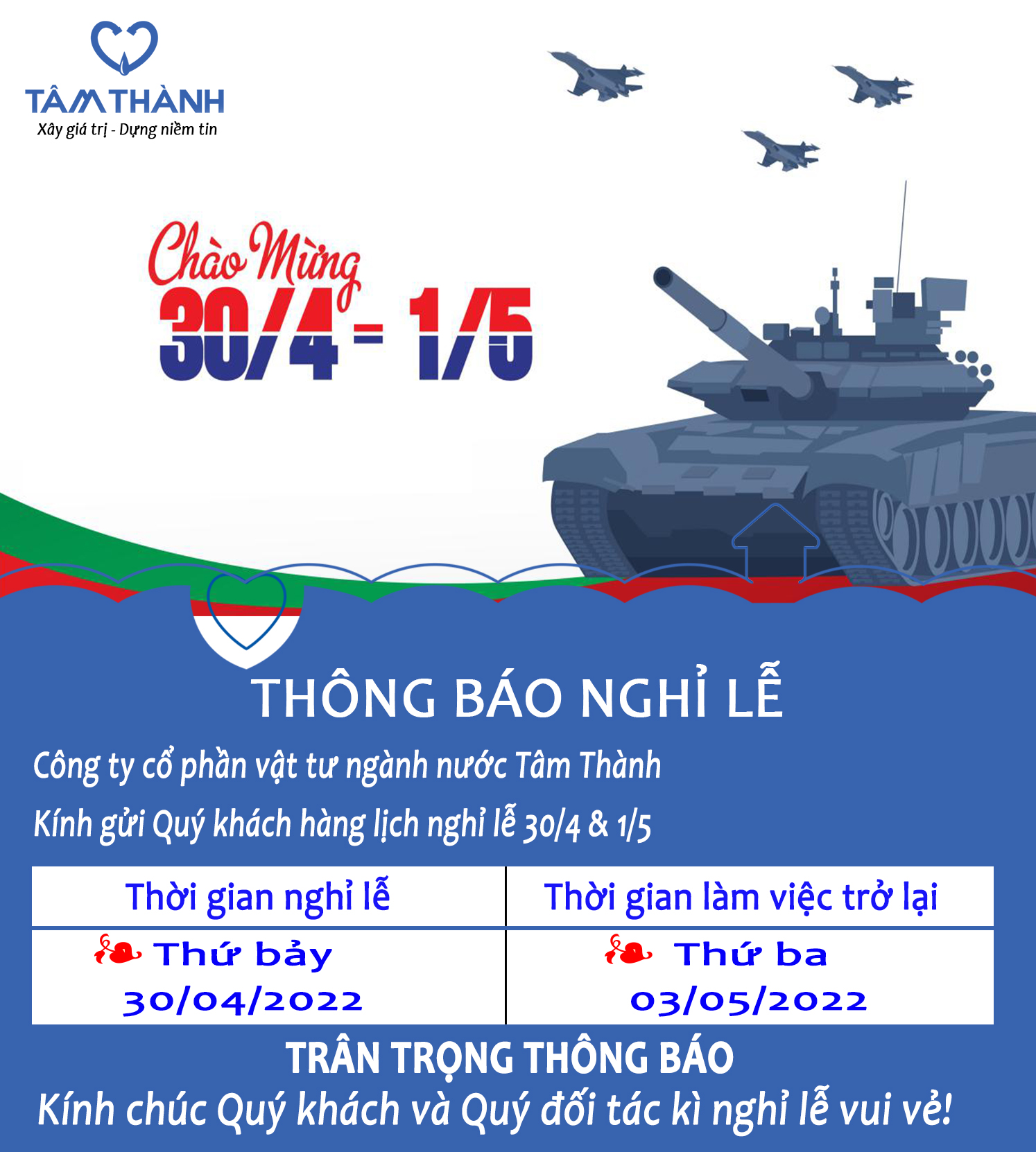 Tâm Thành xin thông báo lịch nghỉ lễ 30/4 - 1/5 của Công ty tới Quý đối tác, Quý khách hàng được biết để sắp xếp thuận tiện cho việc liên hệ công tác: