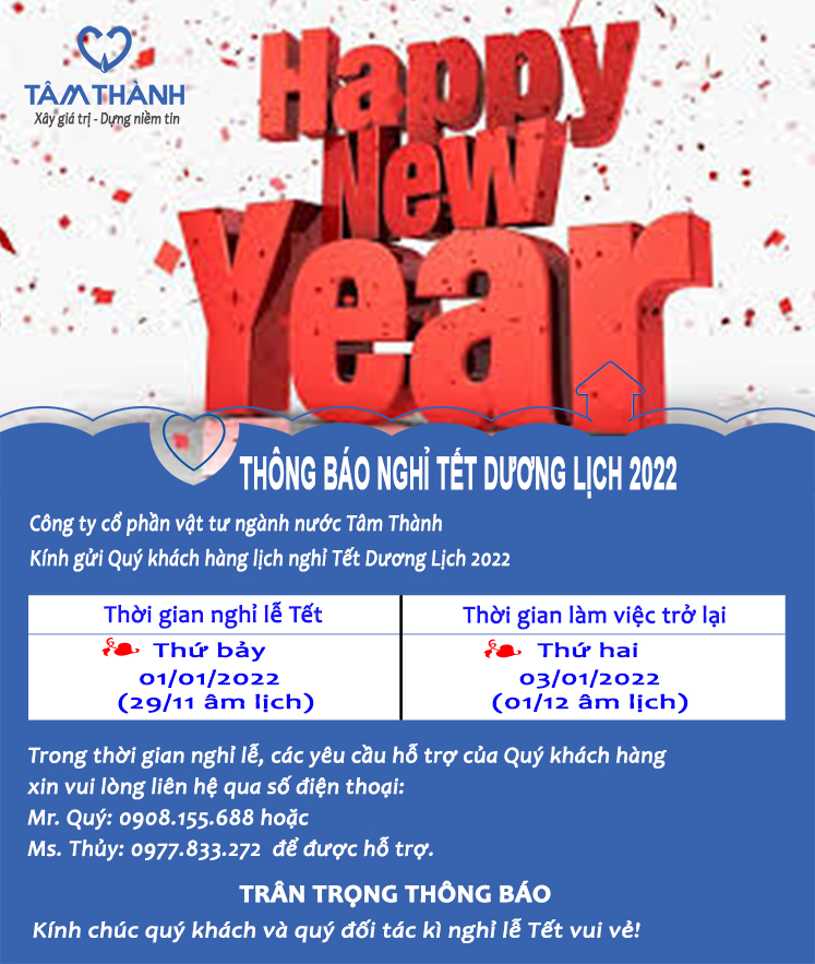 Tâm Thành xin thông báo lịch nghỉ lễ Tết Dương Lịch 2022 của Công ty tới Quý đối tác, Quý khách hàng được biết để sắp xếp thuận tiện cho việc liên hệ công tác: